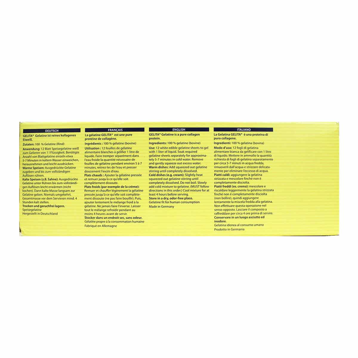 This pack of Gelita Gelatin Leaves consists of individual gelatine sheets (leaves or leaf). These leaves are manufactured and imported from Germany and are mainly used in the Patisserie profession.