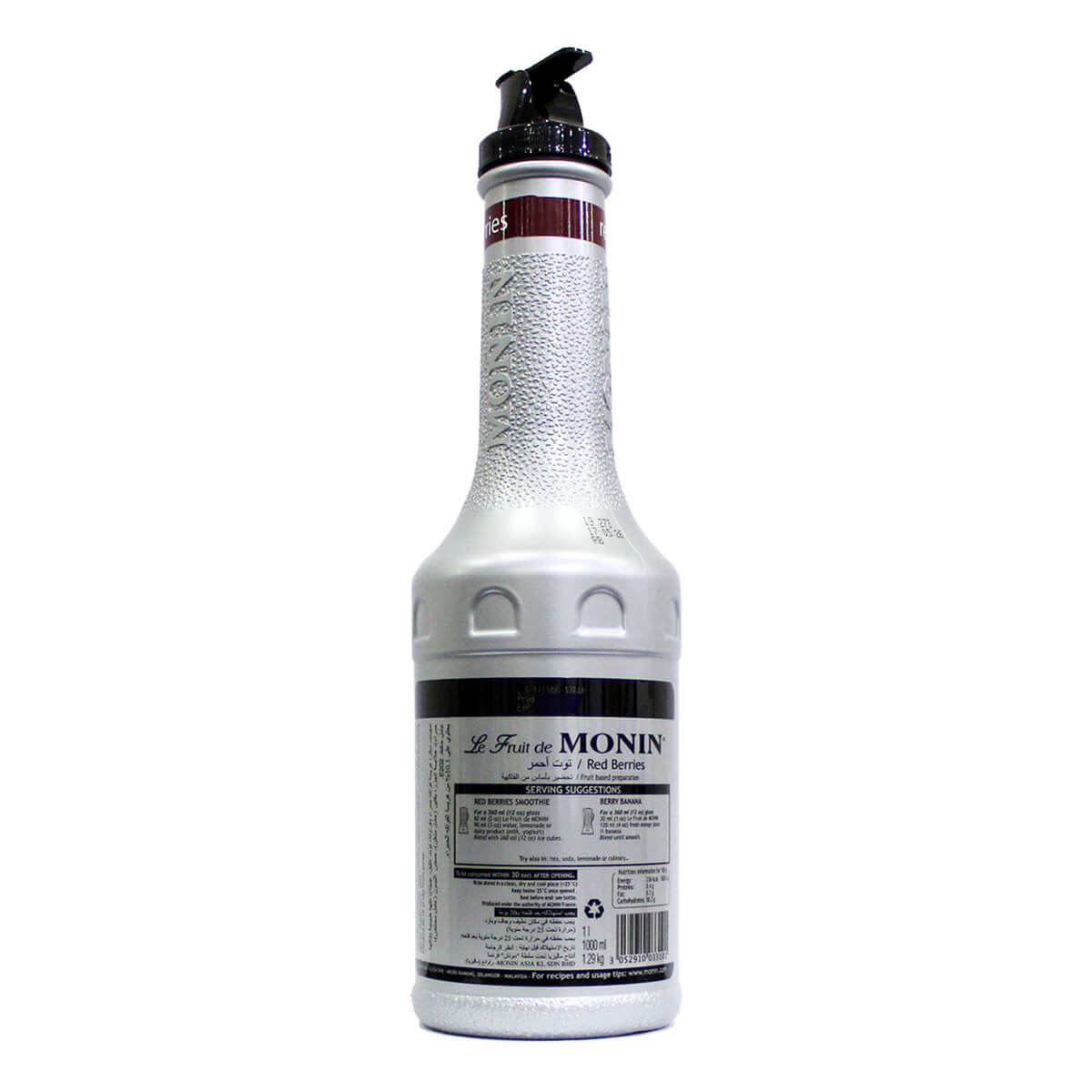 Monin Red Berries Fruit Purée is the finest balanced blend of Strawberries, Raspberries and Blueberries, resulting in a very powerful flavor that is suitable for creating shakes, cocktails, sauces and compotes, iced teas and much more.