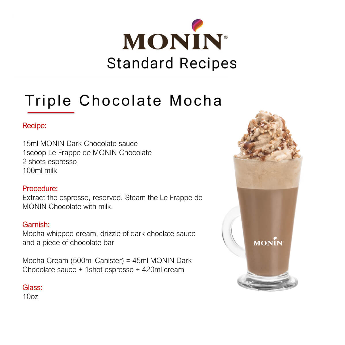 Due to its smooth texture, MONIN Dark Chocolate sauce allows you to create unique hot and cold mochas. It can also be used for glass drizzling or indulgent toppings. Mix with MONIN Wild Mint syrup to create a mint mocha.